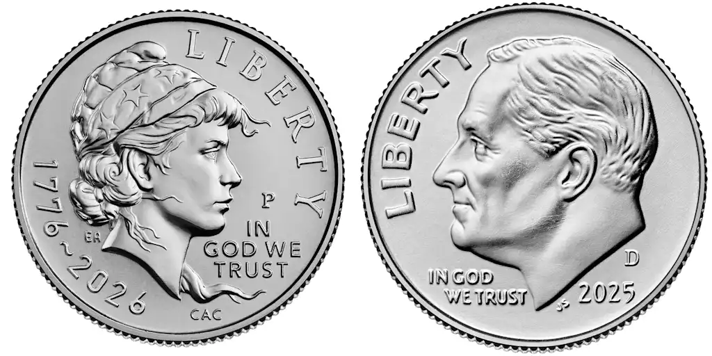 Het nieuwe Emerging Liberty-dubbeltje zal tijdelijk het klassieke Roosevelt-dubbeltje vervangen, met aan de ene kant Franklin D. Roosevelt en aan de andere kant een fakkel, olijftak en eikentak voor vrijheid, vrede en kracht. Het Roosevelt Dime keert terug in 2027.