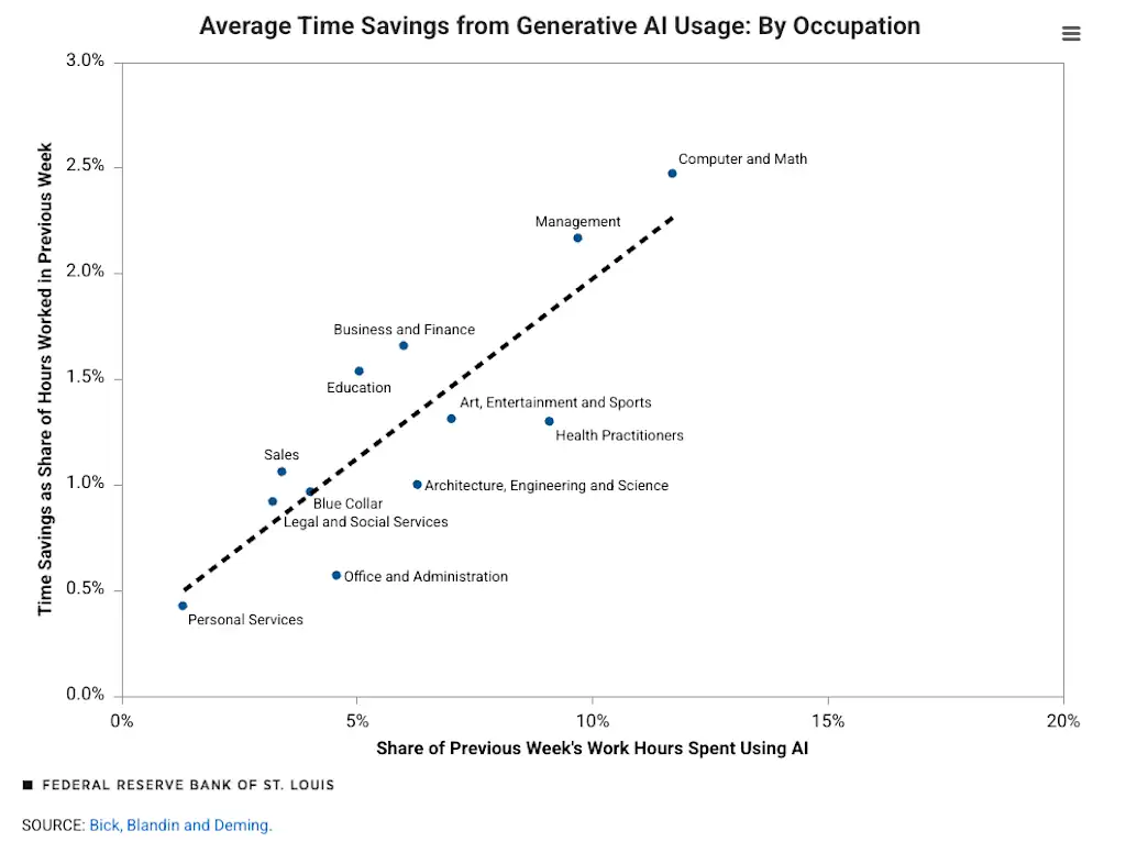 Er is een groot verschil in de impact van AI. Sommige beroepen, zoals softwareontwikkeling, worden volledig getransformeerd door AI. Andere, zoals persoonlijke diensten, worden nauwelijks getroffen. Het is dus misschien niet verrassend dat mensen die zich in de technologiewereld bevinden, voorspellen dat andere industrieën vergelijkbare productiviteitswinsten zullen zien.